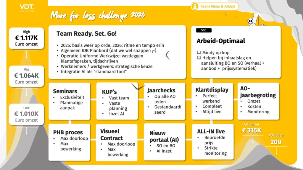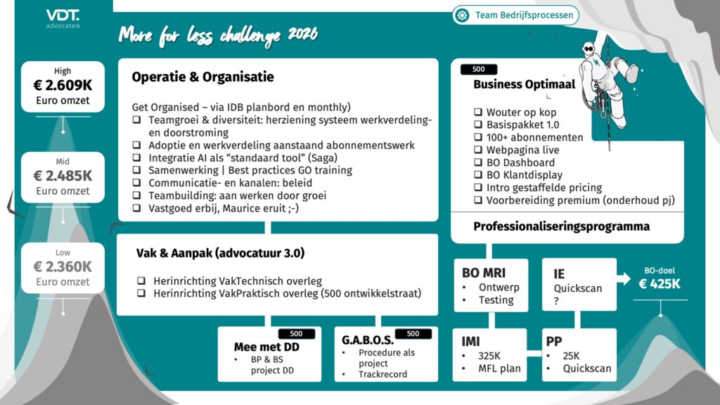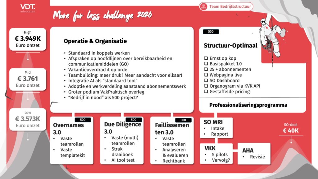 De rode draad van de aftrap? Geen compleet nieuwe koers, maar wél tempo maken. Onze strategie richting 2030 is doorgetrokken naar 2026, met volle focus op advocatuur 3.0, de verdere ontwikkeling van onze abonnementen en AI als structurele versneller in alles wat we doen.